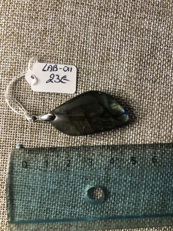 Chaque pendentif est taillé dans une labradorite naturelle. Les reflets, nuances et irisations varient d’une pierre à l’autre, rendant chaque bijou totalement unique.
