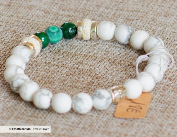 Ce bracelet réunit deux pierres profondément complémentaires : la force transformatrice de la Malachite et la douceur apaisante de la Howlite. Un duo idéal pour les personnes qui souhaitent avancer avec confiance tout en conservant une grande sérénité intérieure.