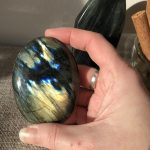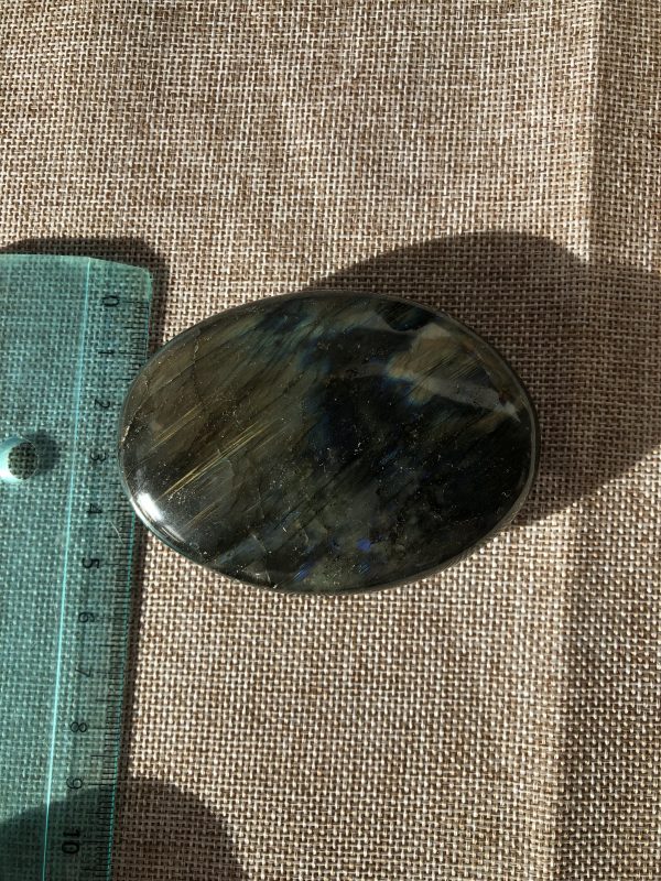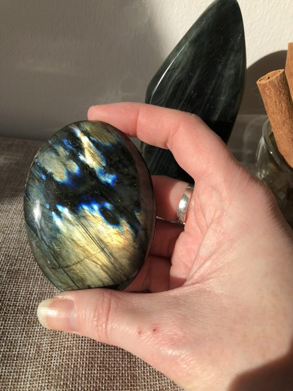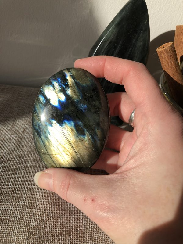 Ces labradorites ont été choisies pour leur format, leur poids généreux et la qualité exceptionnelle de leurs reflets. Il est rare de trouver des pierres de cette taille avec une labradorescence intense et équilibrée.