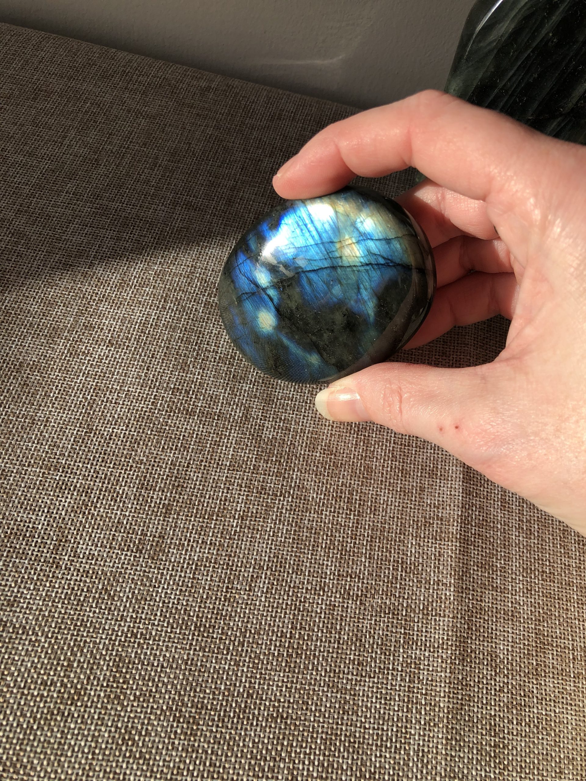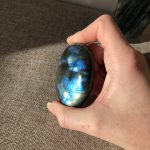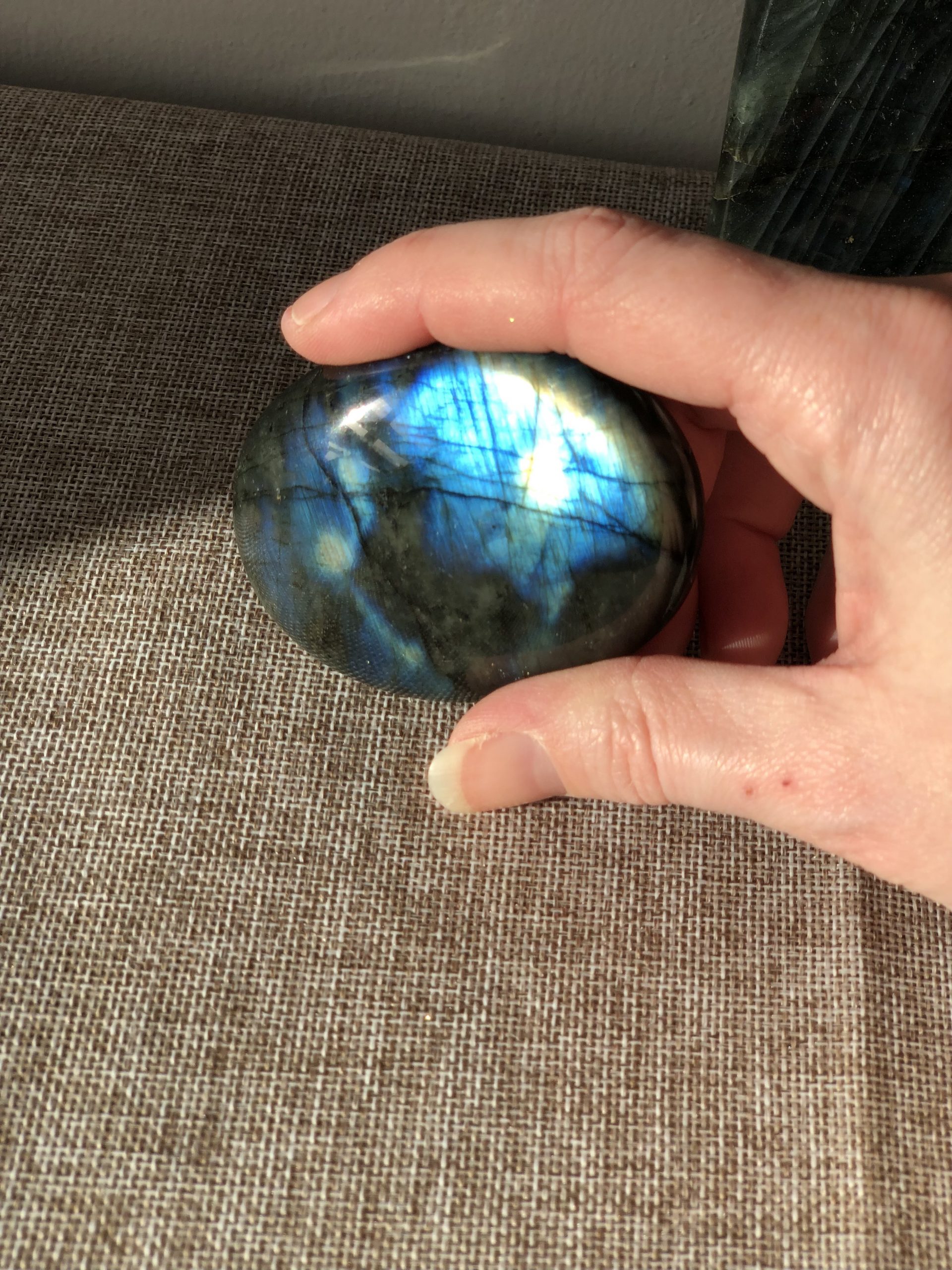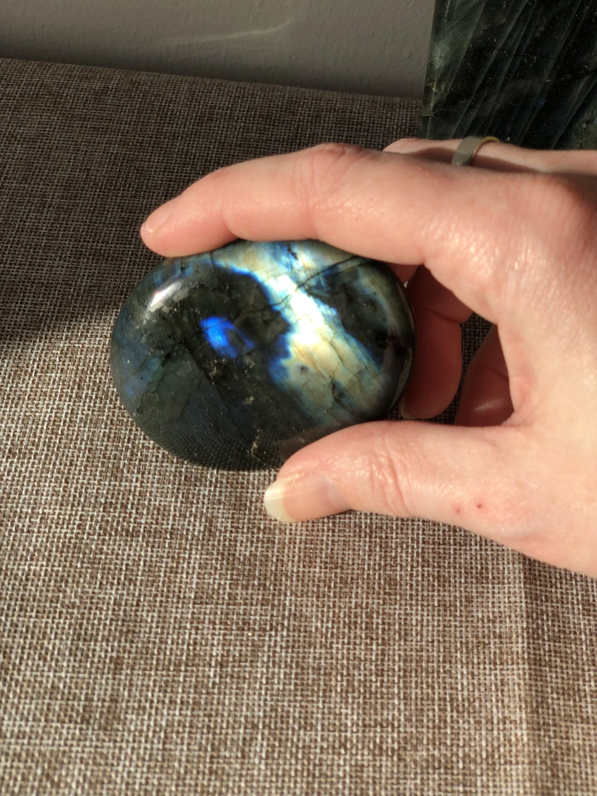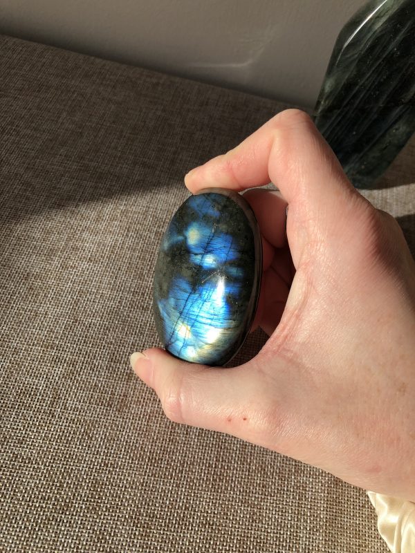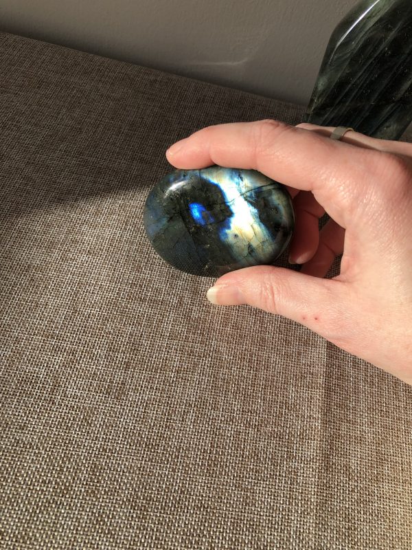 Ces labradorites ont été choisies pour leur format, leur poids généreux et la qualité exceptionnelle de leurs reflets. Il est rare de trouver des pierres de cette taille avec une labradorescence intense et équilibrée.