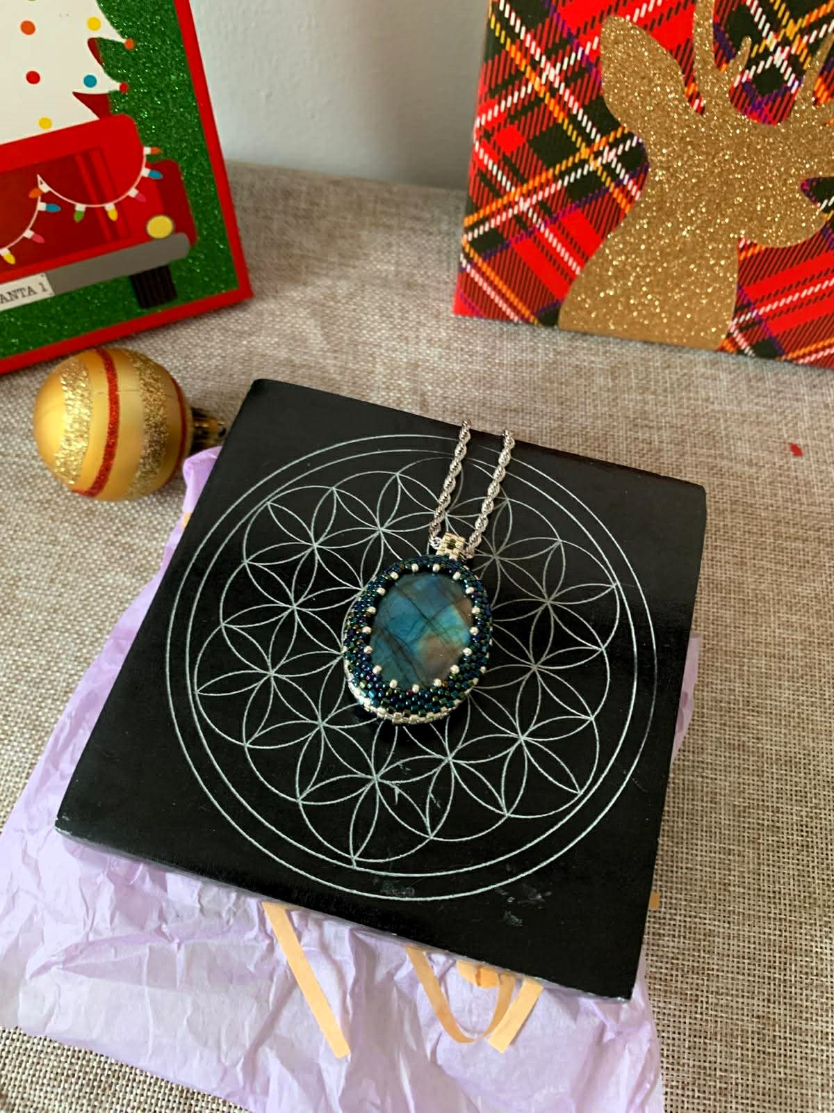 Ce coffret a été imaginé pour offrir un moment de beauté, de douceur et d’énergie positive. Il réunit deux pièces soigneusement sélectionnées : un collier en labradorite entièrement serti de perles de verre et une boîte à bijou en stéatite ornée d’une fleur de vie gravée.