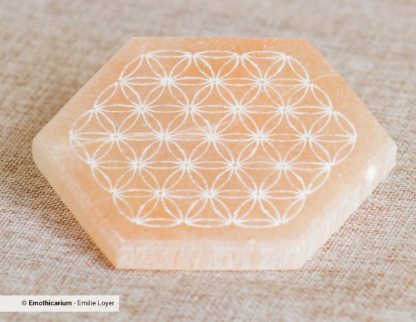 Cette Fleur de Vie gravée sur un plateau en sélénite à six côtés unit la puissance de la géométrie sacrée à la lumière cristalline de la sélénite. L’hexagone, forme parfaite de la nature (comme dans les alvéoles d’abeilles), représente l’ordre, la structure et l’équilibre universel. Associé à la Fleur de Vie, il devient un outil énergétique d’une grande précision, idéal pour amplifier et stabiliser les vibrations.
