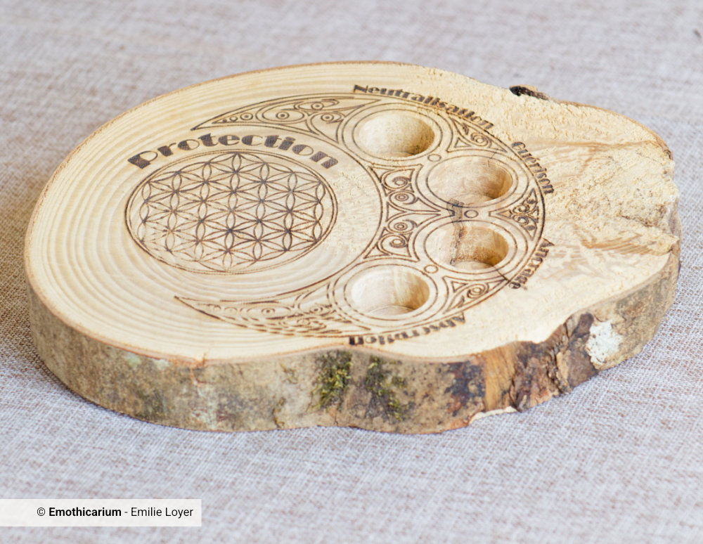 Le plateau Protection est conçu comme un véritable gardien énergétique. Sa fleur de vie, symbole d’harmonie et de force universelle, agit comme un purificateur, tandis que les quatre zones gravées autour du plateau se relient aux axes fondamentaux de la protection :