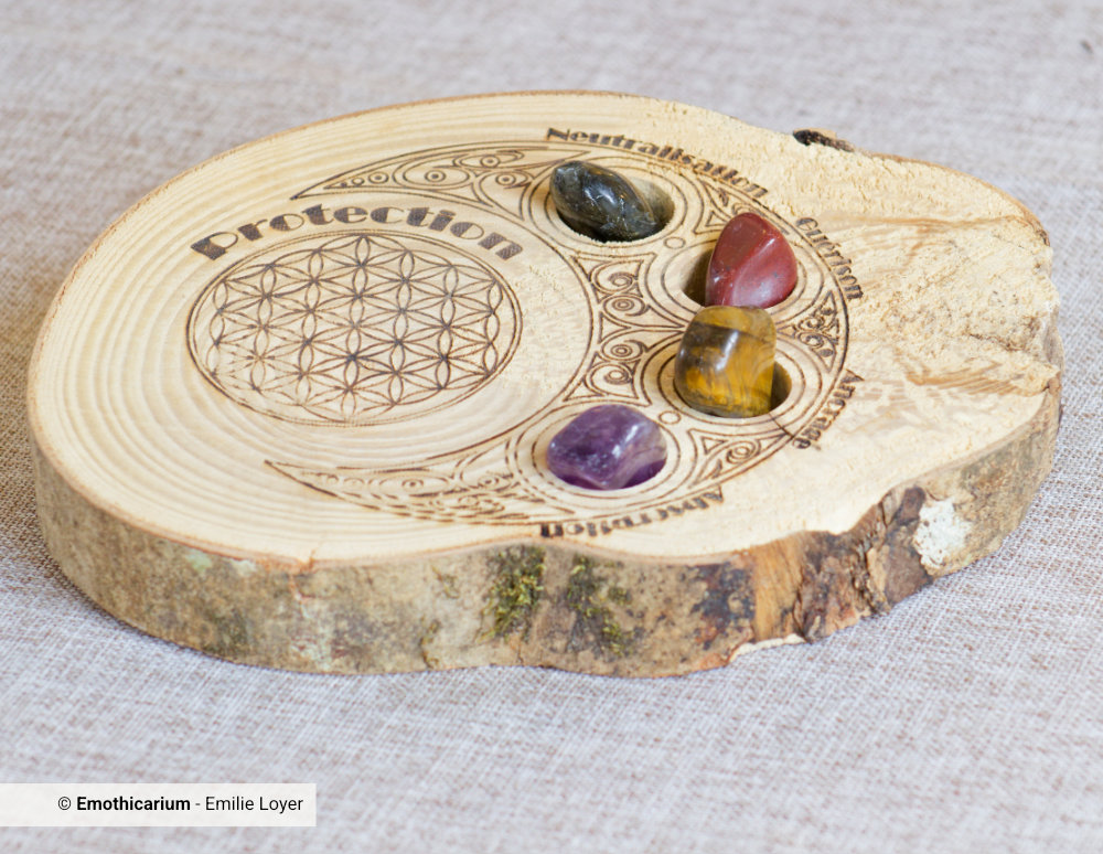 Ce plateau est conçu pour accueillir quatre pierres soigneusement sélectionnées pour leurs énergies complémentaires :